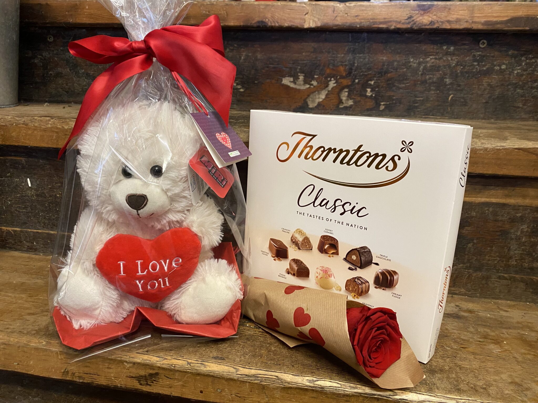 Cute bear holding a heart (10 inches tall) with large box of chocolates and a gift wrapped real red rose